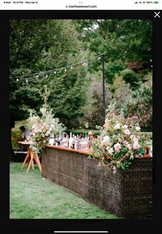 LOUNGE. BAR. Wondering if lounge area(s) is possible. Tent might be too small. Was also thinking comfy chairs/table for cocktails in addition to hightops. It’s be great to have a lounge-y sitting area just outside tent so it can be used for both cocktails and reception when folks want some fresh air, but I can’t remember if the lawn slopes down too much. Or maybe a lounge area for the cigars a little further from the tent. The black bar looks great, love that.